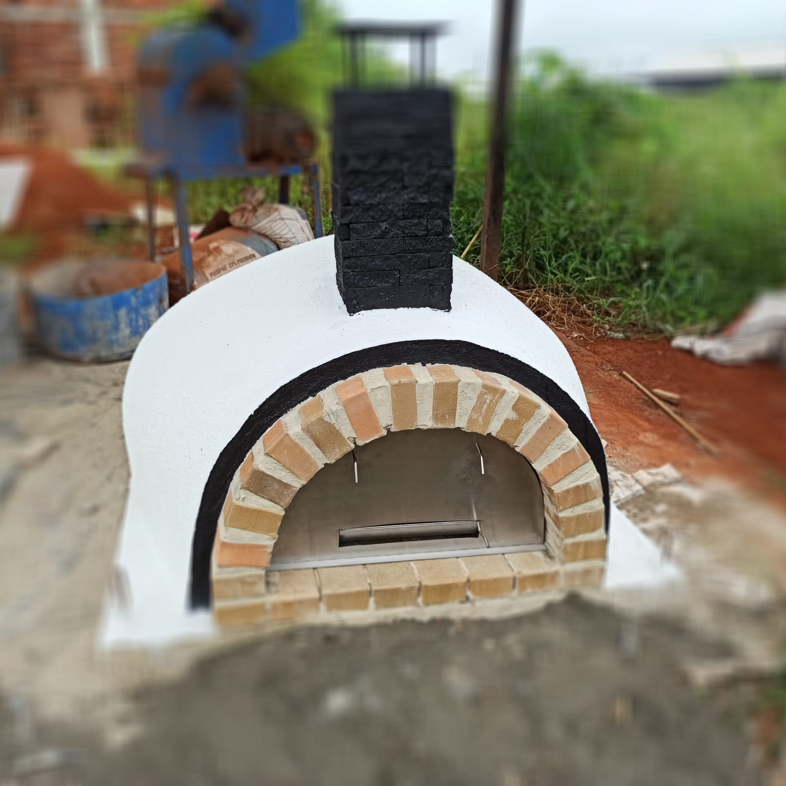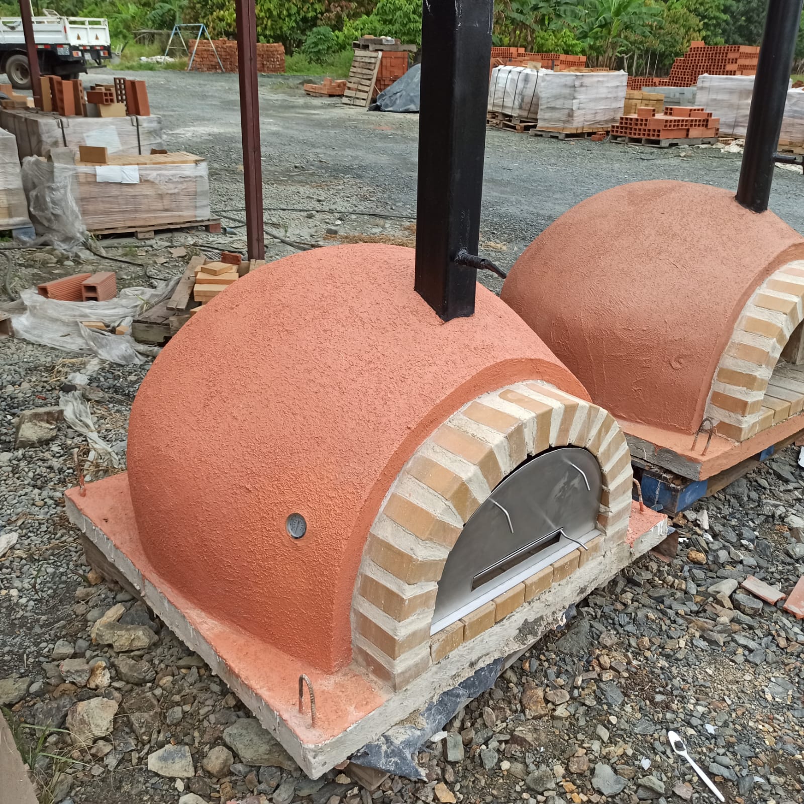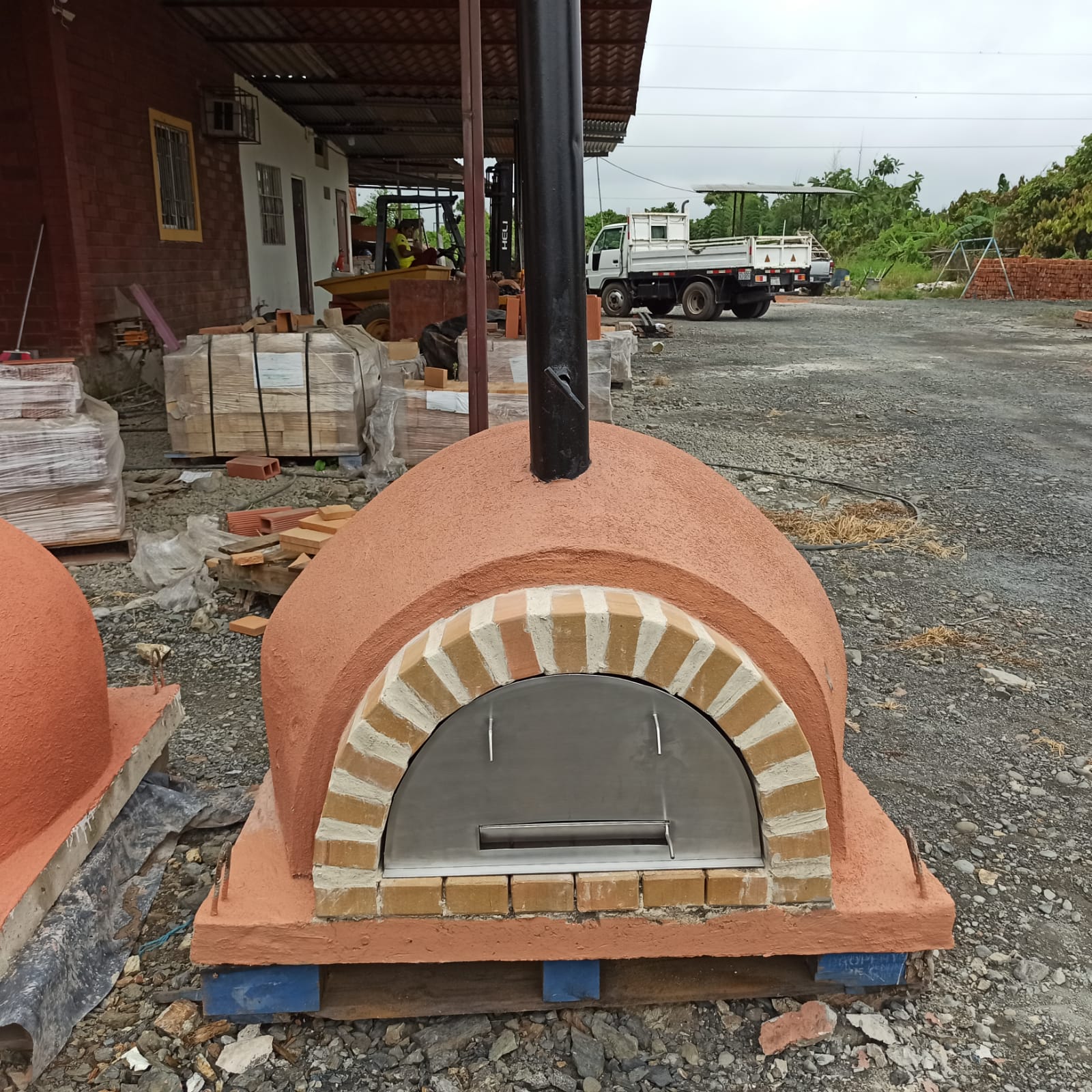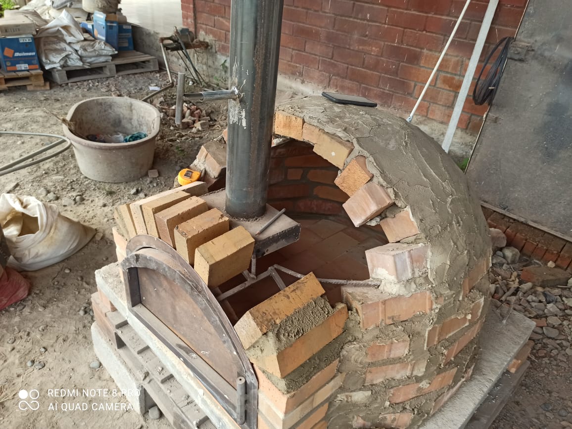 Horno de leña de ladrillo refractario, fabricado sobre una loza de concreto, piso con vidrio molido, mortero refractario y plaquetas refractarias.